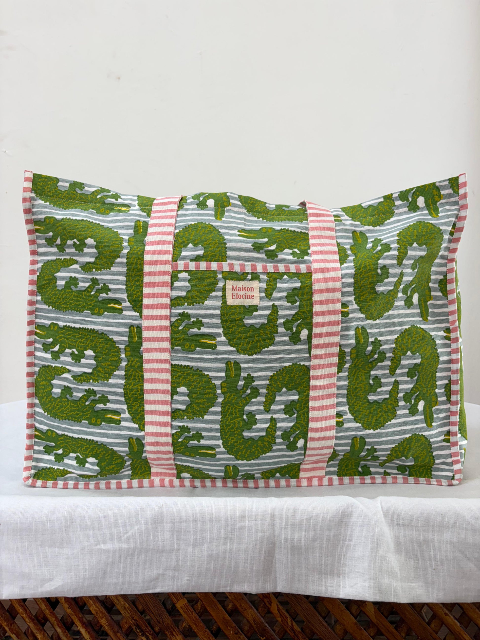 The gator tote comes in 2 colorways, a subtle blue stipe or a more playful pink!